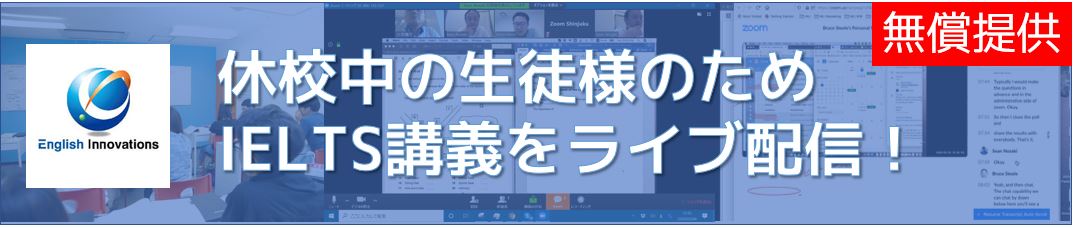 イングリッシュイノベーションズは、この度、コロナウィルスの影響により突然休校になった学生様向けにIELTS講座を無料でライブ配信することを決定しました。