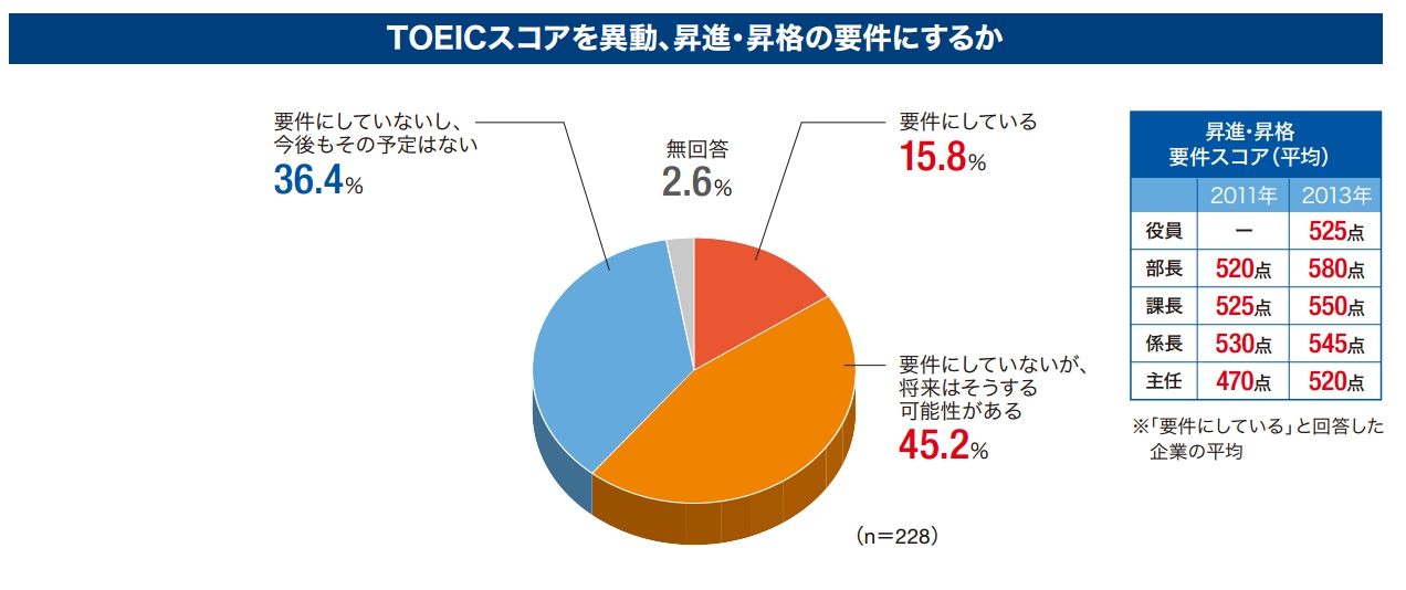 図が示す通り、今後の予定も含めると6割以上の企業がTOEICスコアを昇進や異動などの条件にもする、しているようです。