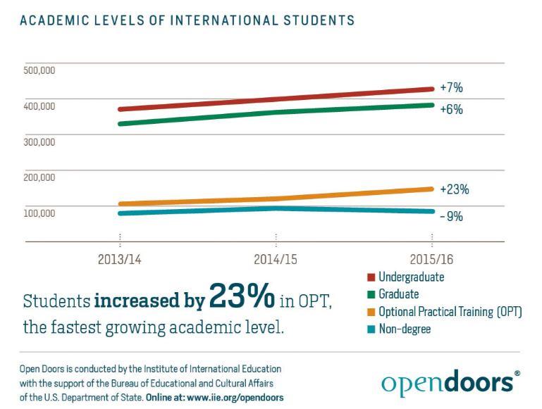 一番増えているのはOPT(Optional Practical Training)。これは簡単に言うとインターンみたいなもので、学生というステータスですが、企業で働きながら研修を受けている学生です。23%も増えています。