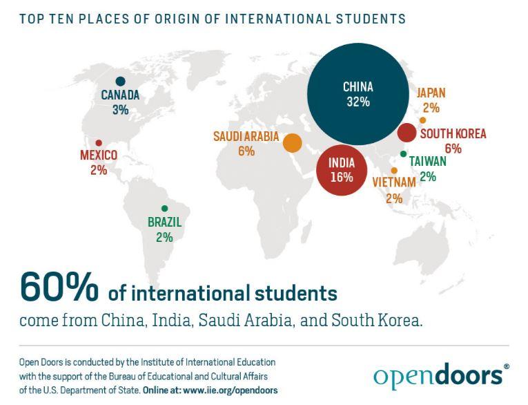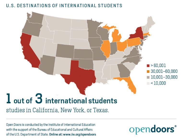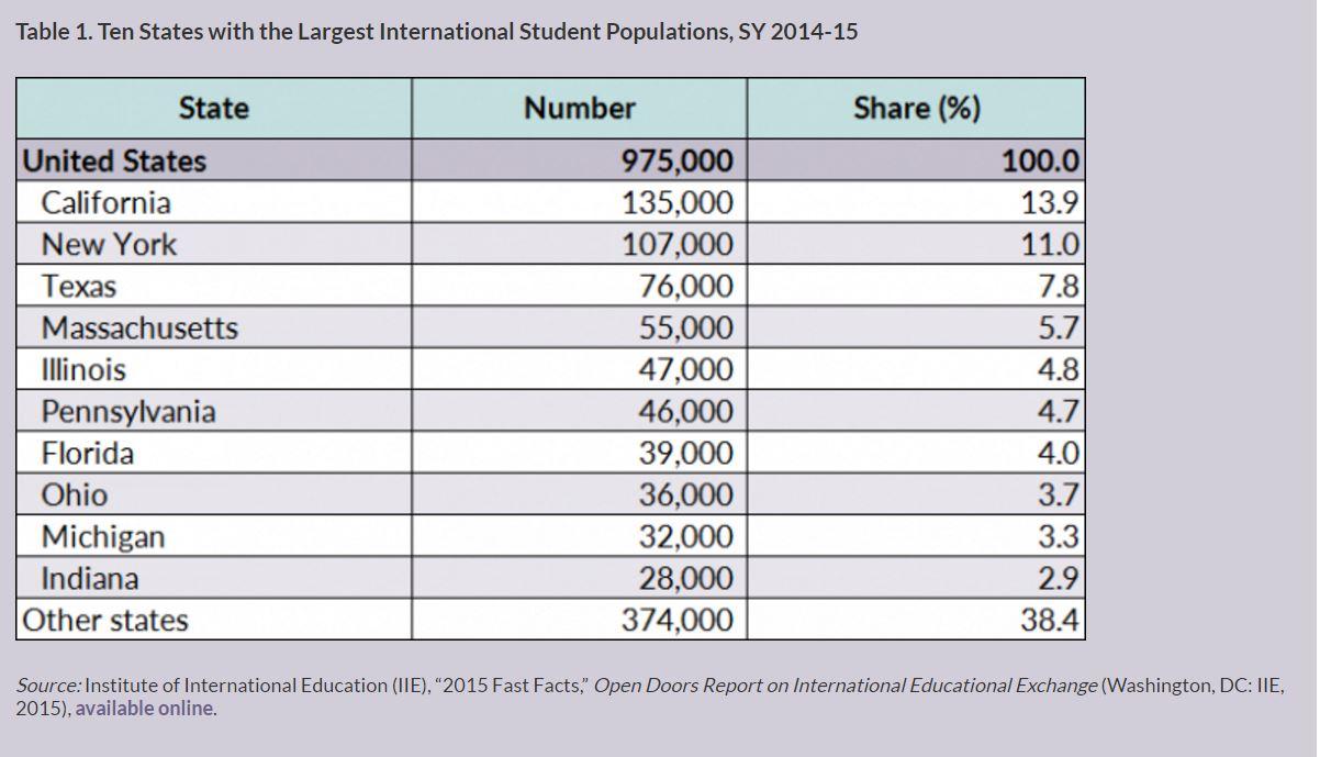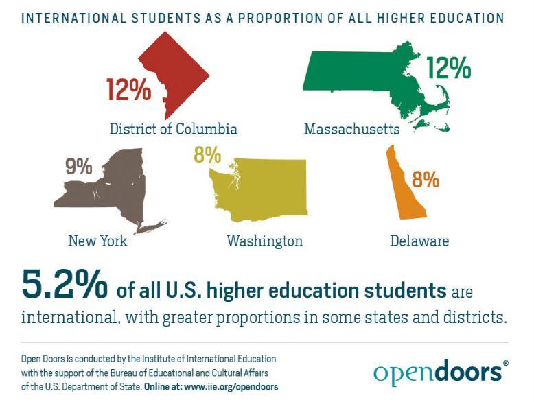 州によっても留学生の割合は大きく異なりますが、コロンビアやマサチューセツ州では12%を占めるまでになっています。