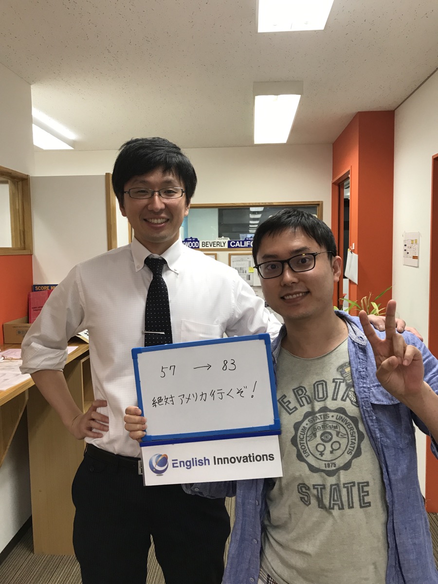 「イングリッシュイノベーションズに通おうと思ったきっかけは授業が英語、点数保証がついている、TOEFL専門だったから。受講前と比べてTOEFLの勉強方法が良くわかった。6週間に一度本番同様のPractice Testがあったのも良いペースでよかった。はじめは1年間続けていたら、点数が本当に伸びるのかが心配でしたが、継続してやり続けたのが一番よかったようで、無事目標達成できました。講師のAndyには特に感謝しています。授業時間外でも自主的に勉強できる仲間ができて、年末年始に集中的にTOEFLの練習問題を解いたことが年明けのスコアアップに繋がったと思います。これからは大学院に合格するためにTOEFL以外のテストや書類(エッセイ)の作成に励んでまいります。