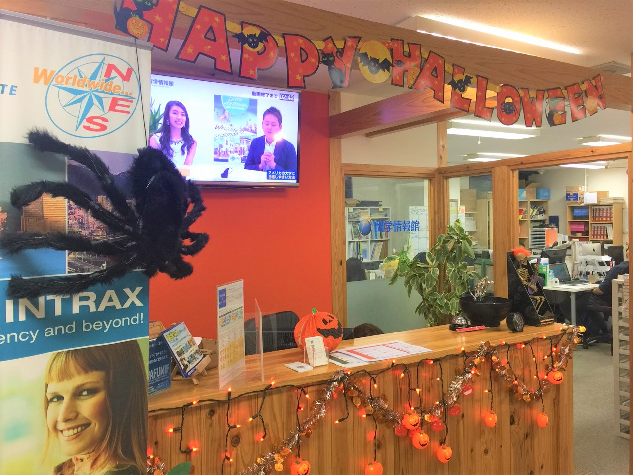 なんといってもうちの一番の特徴は、アメリカ語学学校のスタイルをそのまま持ってきている授業と雰囲気でしょう!こちらは、ハロウィンの時期の受付の様子♬