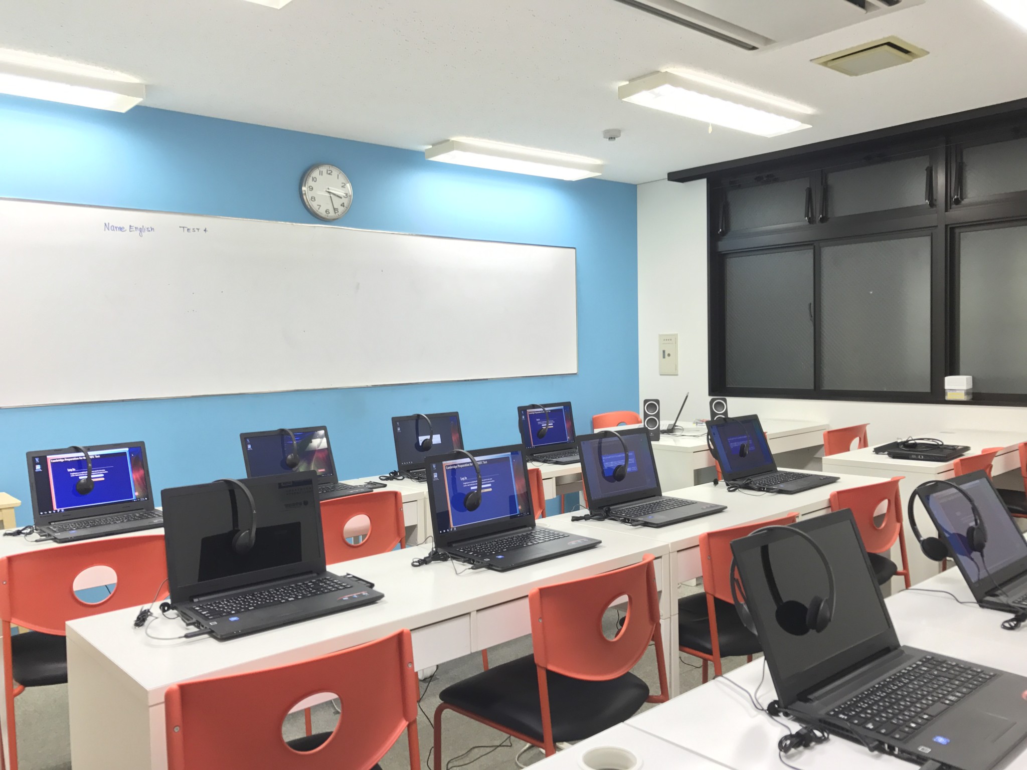 新宿校のクラスは全部で4つあり、TOEFLのクラスの方には一人ずつPCの設置がされています。TOEFL ibt本番同様の環境で行うことにこだわっています。