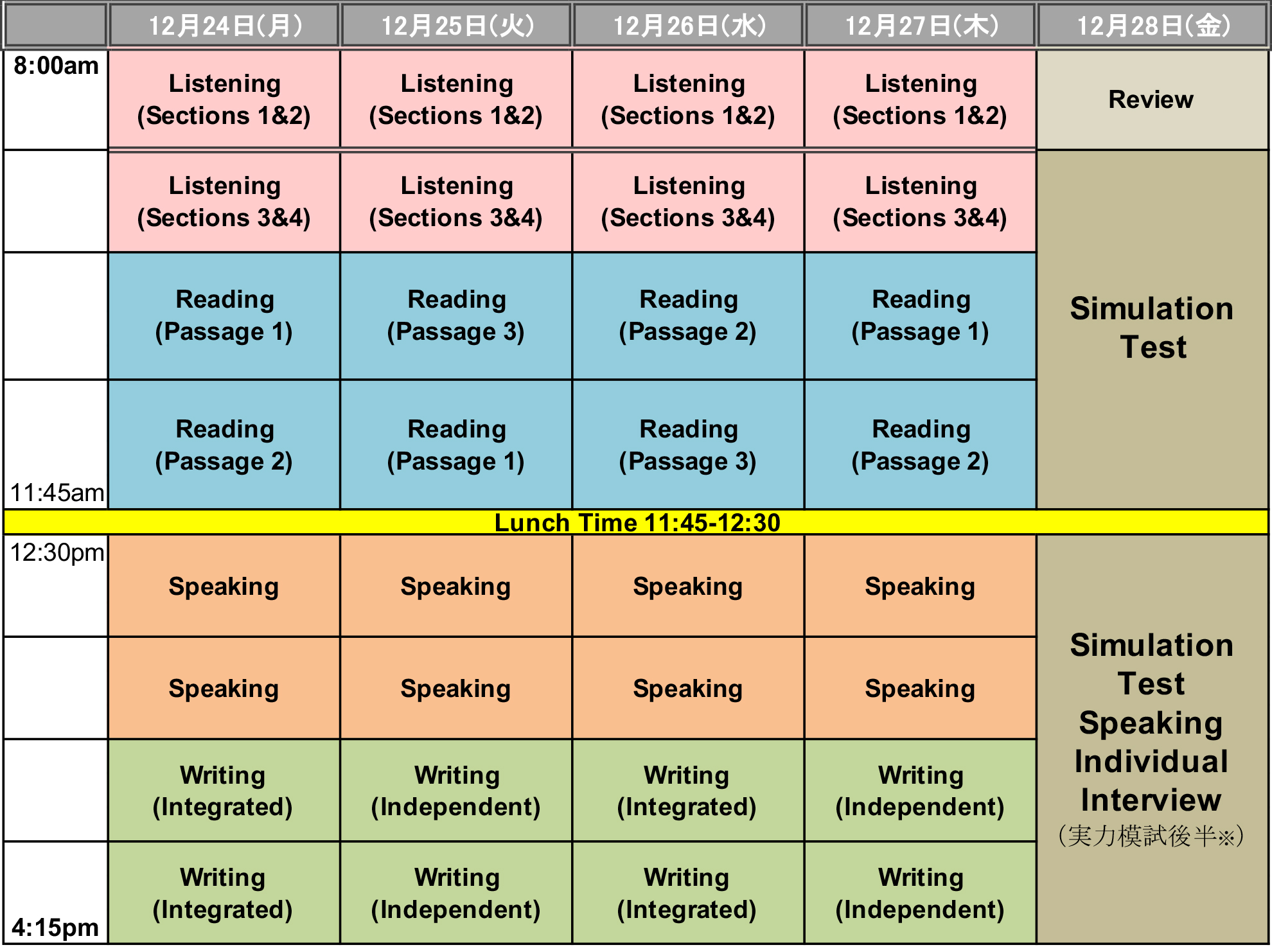 どのようなスケジュール、カリキュラムで開催しているのか、それぞれのテストごとに見ていきましょう。