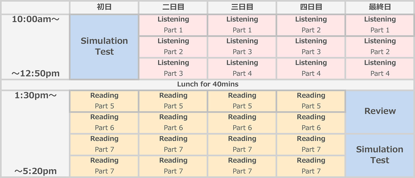 TOEIC公式テストの日程に合わせて、その前の週末、祝日を使い2週間、もしくは3週間にわけて5日間の集中講座を行います。