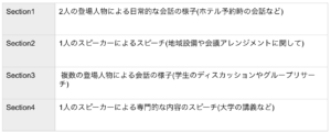リスニングパートは4つのパートに分かれていて、セクションごとに10問ほどの設問に答えます。なので、4パートの合計問題数は40問となっています。