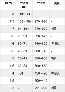 下記に他の英語試験とのスコアを比較する為の換算表を用意しました。