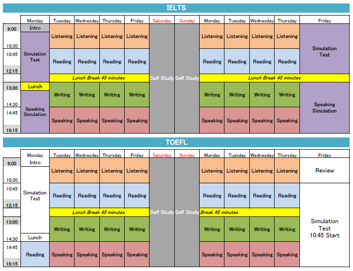 TOEFL、IELTSともに10日間、60時間のコースとなります。