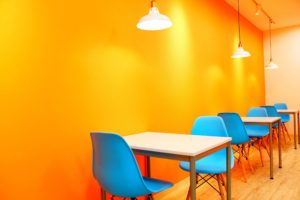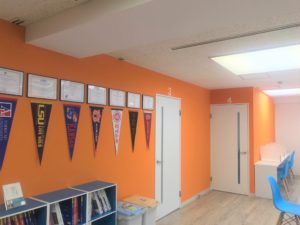 校舎内は、オレンジ色をメインにブルーなどをあしらいとても明るい雰囲気の校舎になっています。